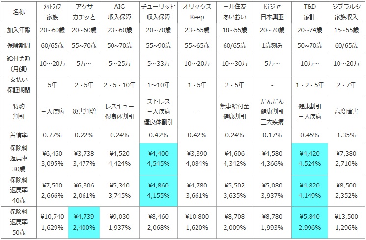 次に下図では各社の収入保障保険を、加入できる年齢・保険期間・月額の給付金・支払い保証期間に加え、付加できる特約・割引制度などで比較した。参考までに苦情率(苦情数÷契約数 ※生命保険協会公表)を算出し顧客満足度を図る参考指標とした。さらに給付金額を月額20万円で契約した場合の保険料を30・40・50歳の男性で比較し、各々15年後・10年後・8年後に死亡した場合の返戻率(支払った保険料が何%で戻るか)でも併せて比較した。