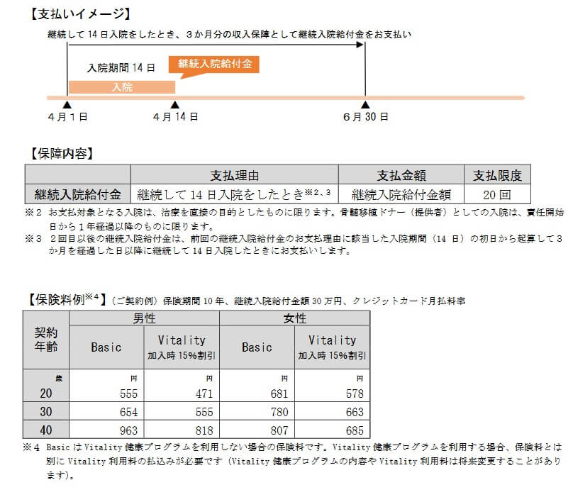 収入パスポート特約は2023年3月から開始した特約で、主に短期での就労不能をカバーできます。この特約を付けると継続して14日以上の入院をした時に継続入院給付金は受け取れます。特約分の保険料は月額555円(20歳時)で30万円の給付金が受け取れます。