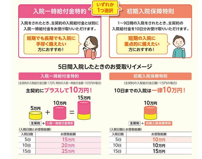 入院一時給付金特約を付けると、主契約の入院給付金とは別に入院一時金が入院すると受け取れます。入院一時金は5~20万円まで自分で設定できます。初期入院保障特則は1~9日までの入院であれば、まとめて10日分の入院給付金が受け取れ、10日を越えると1日毎に入院給付金が受け取れます。その他に三大疾病での入院は給付日数が無制限(他の病気は60~120日まで)となる3大疾病入院支払日数無制限特約も付けられます。